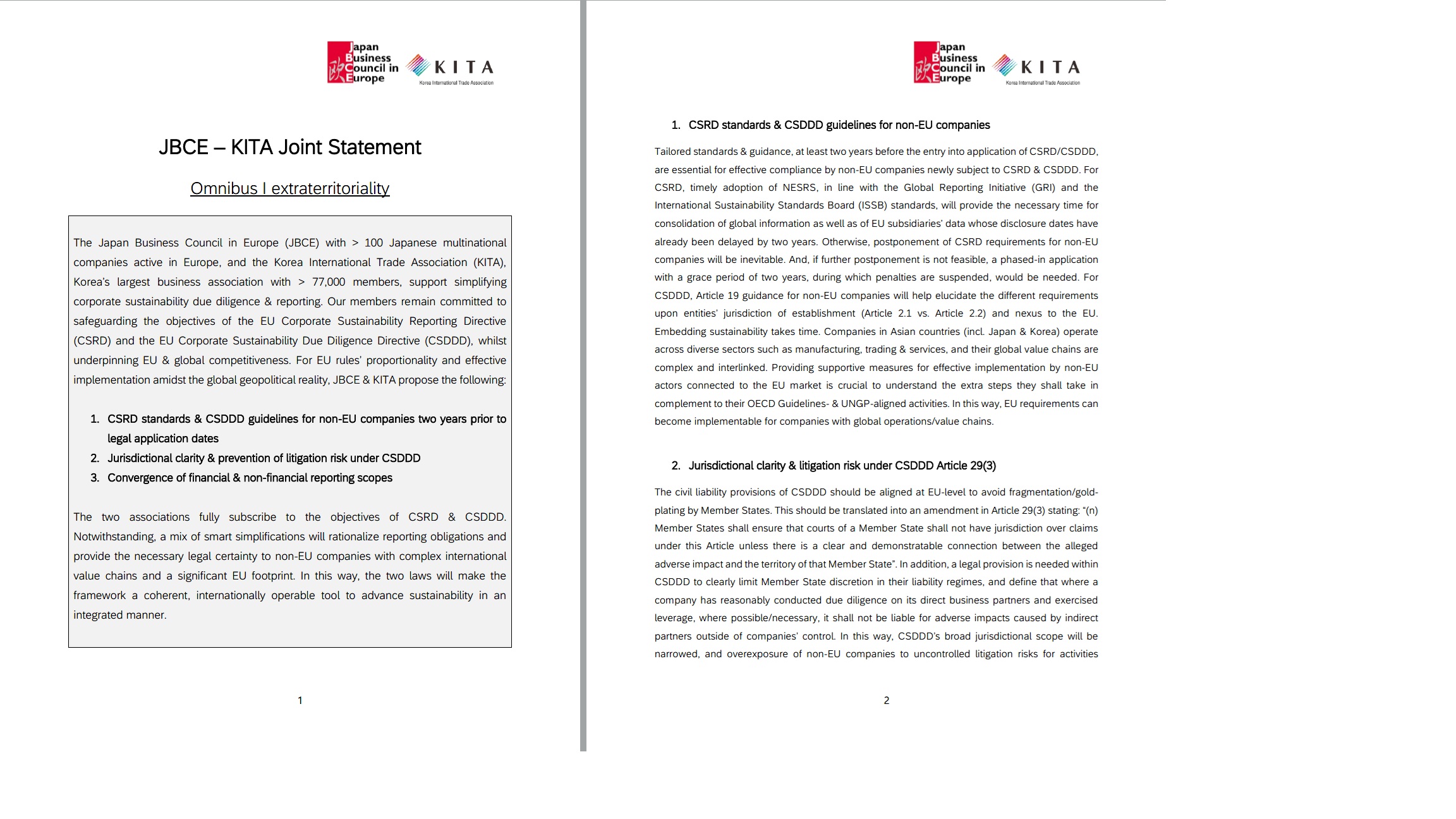 한국무역협회(KITA)는 재유럽일본비즈니스협의회(JBCE)와 공동으로 옴니버스 패키지 내 CSRD(기업지속가능성보고지침), CSDDD(공급망실사지침)에 대한 공동 성명서를 발표하였습니다. KITA는 유럽 의회 및 집행위, 관련 기관 등에 우리 기업의 의견을 전달하고 아웃리치를추진할 예정입니다.