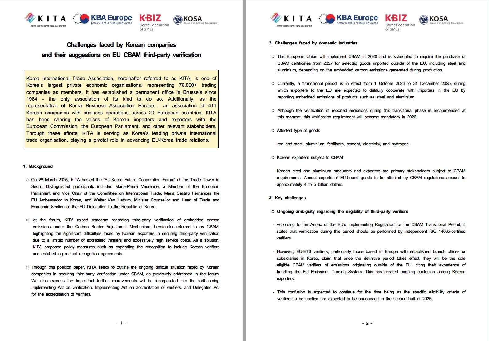 EU 집행위에 CBAM 관련 포지션 페이퍼 제출(2025.6.20)
